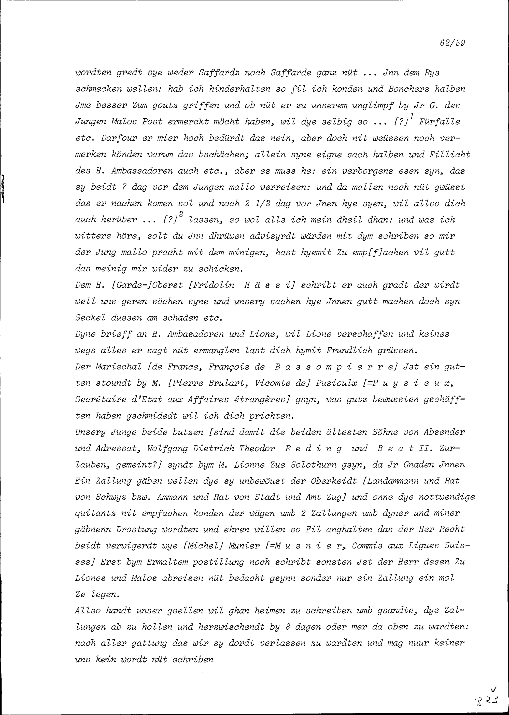 Schreiben von Heinrich Reding, Gardehauptmann, an Konrad III. Zurlauben, Gardehauptmann,...