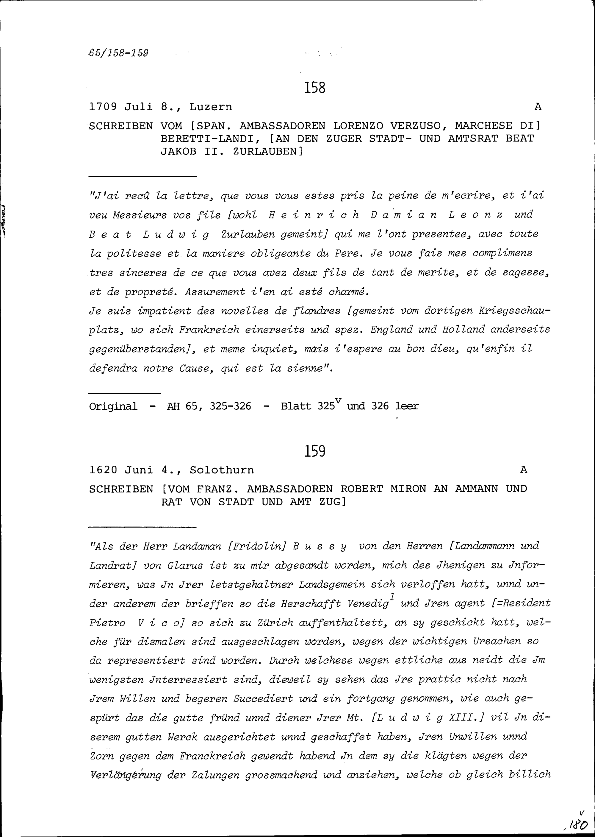 Schreiben von Lorenzo Verzuso, Marchese di Beretti-Landi, Ambassador von Spanien, an Beat Jakob II. Zurlauben, Stadt- und Amtrat Zug