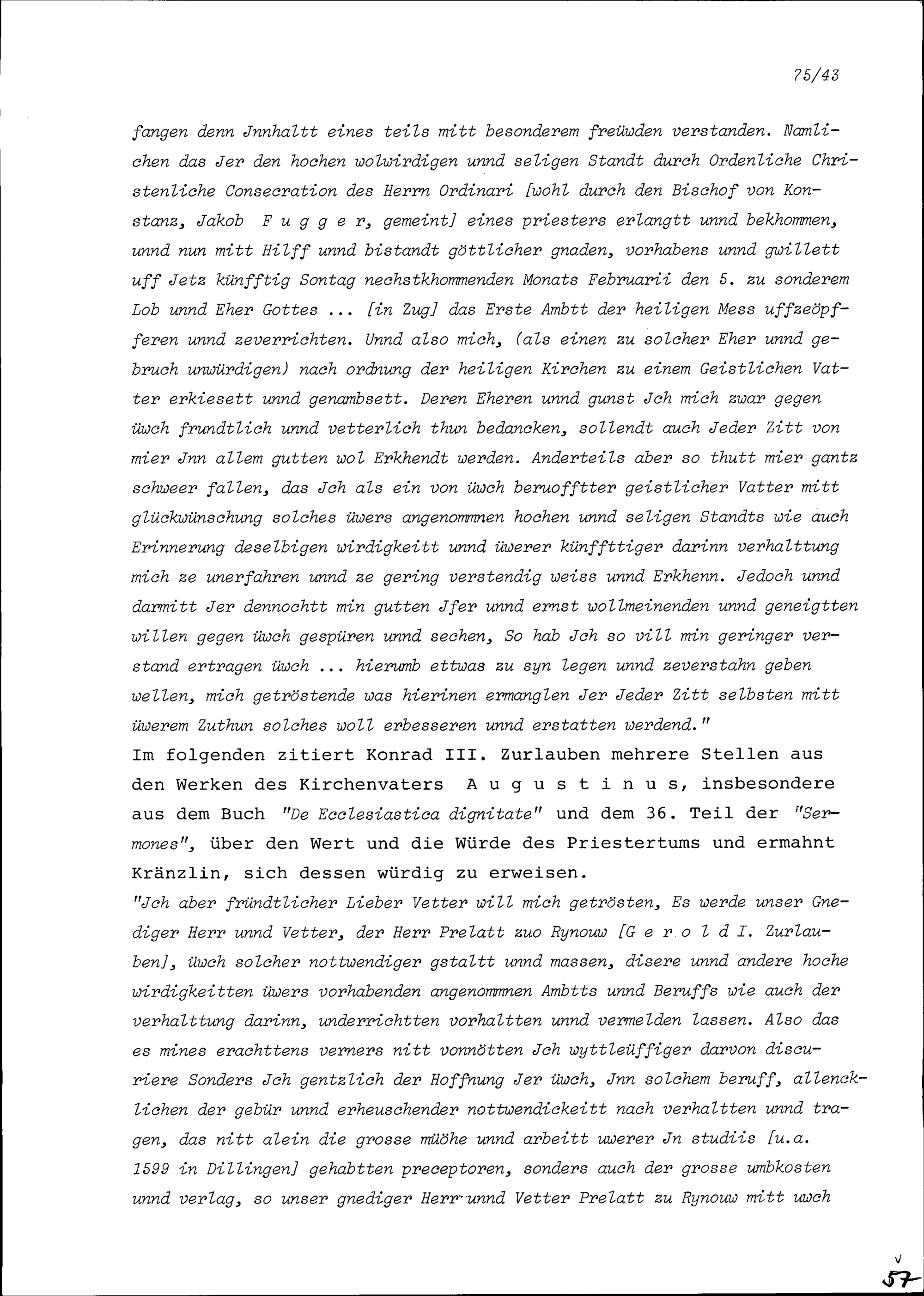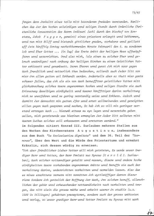 Schreiben von Konrad III. Zurlauben an Michael Johann Kränzlin, seinen Geistlichen Sohn und Pfarrer in Klingnau