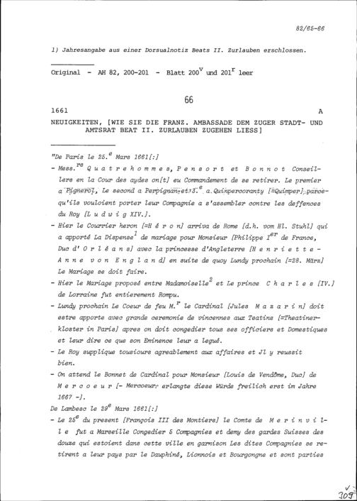 Neuigkeiten aus der französischen Ambassade an Beat II. Zurlauben, Stadt- und Amtrat Zug