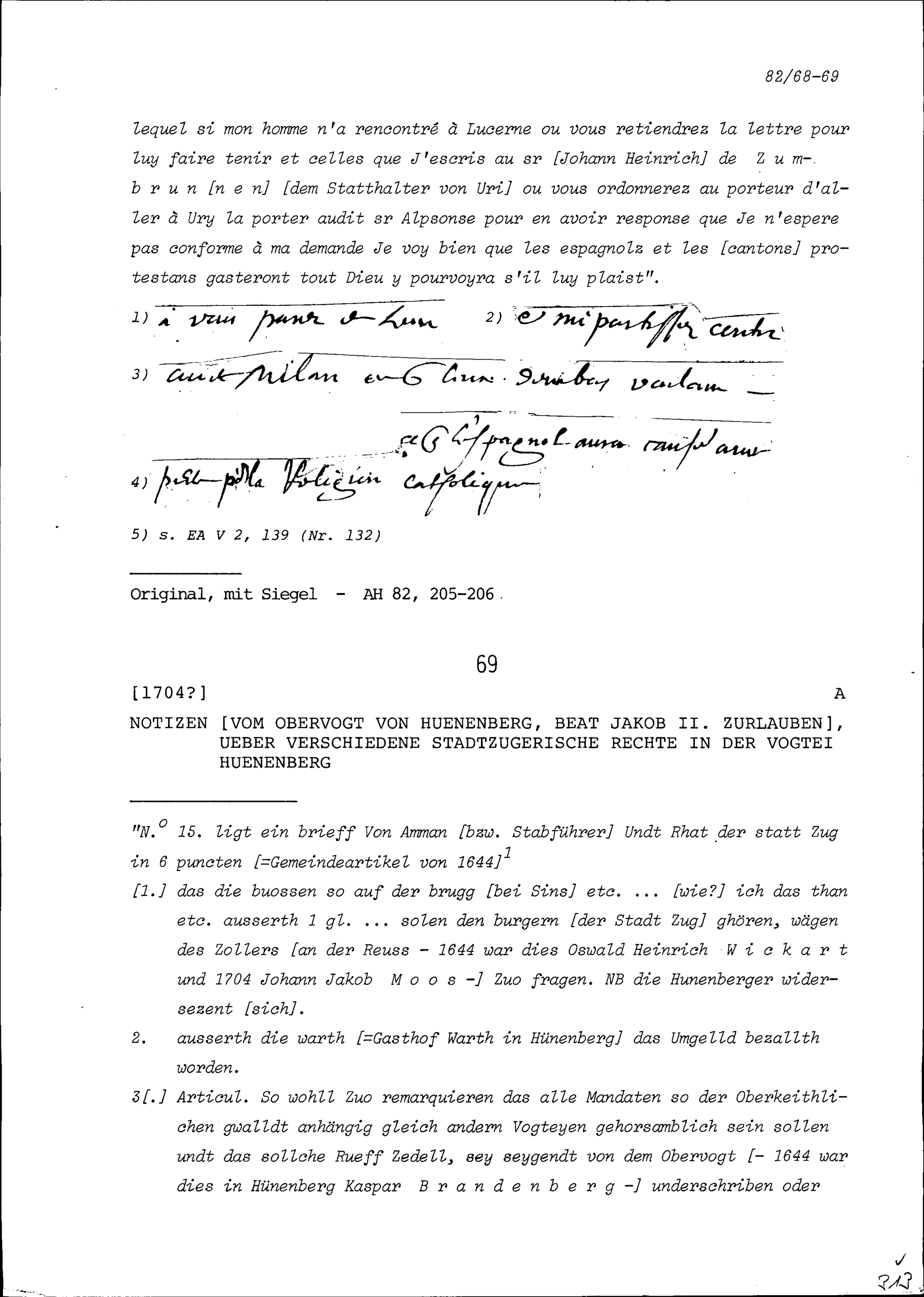 Notiz von Beat Jakob II. Zurlauben, Obervogt von Hünenberg, über verschiedene stadtzugerische Rechte in der Vogtei Hünenberg