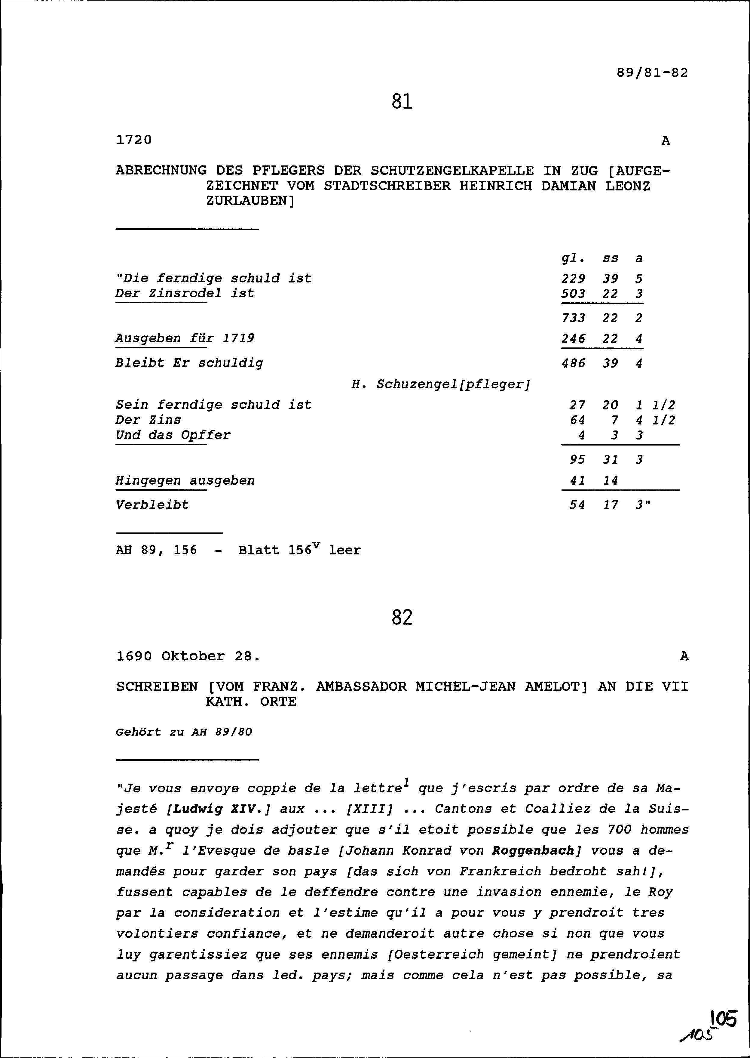 Abrechnung des Pflegers der Schutzengelkapelle in Zug, aufgezeichnet von Heinrich Damian Leonz Zurlauben, Stadtschreiber