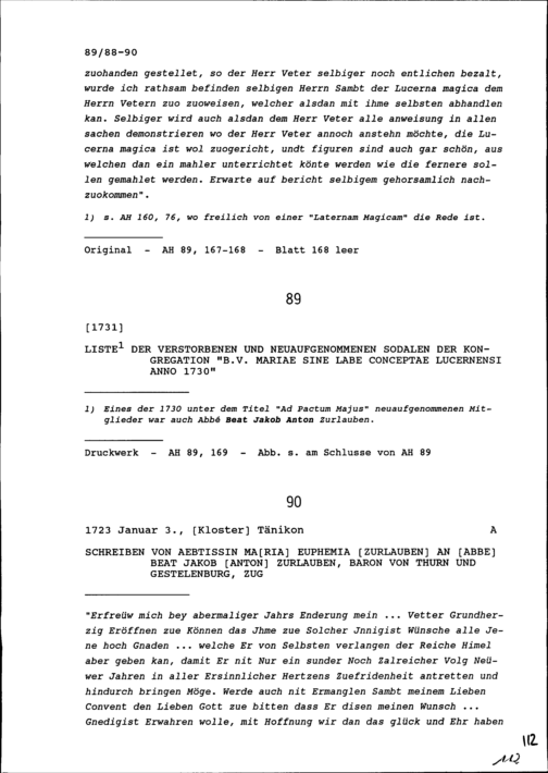 Druck: Liste der verstorbenen und neuaufgenommenen Sodalen der Kongregation B.V. Mariae sine labe conceptae Lucernensi anno 1730