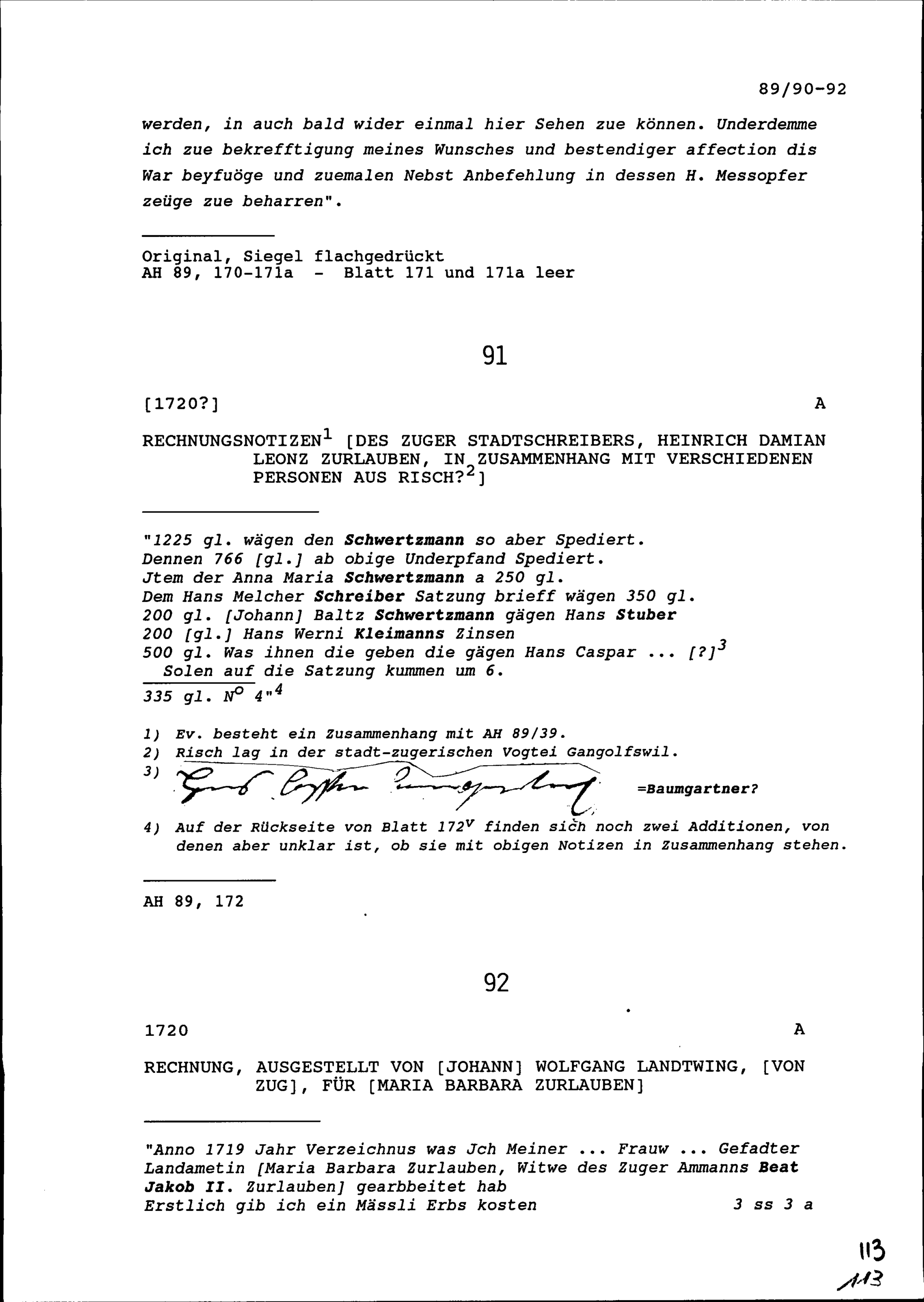 Rechnungsnotiz von Heinrich Damian Leonz Zurlauben, Zuger Stadtschreiber, in Zusammenhang mit verschiedenen Personen aus Risch