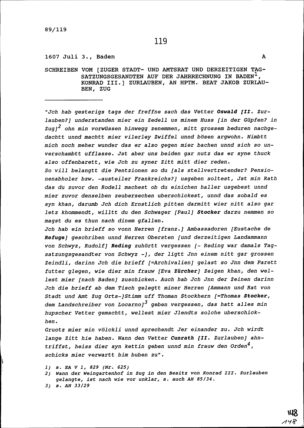 Schreiben von Konrad III. Zurlauben, Stadt- und Amtrat Zug und Tagsatzungsgesandter auf der Jahrrechnung in Baden, an Beat Jakob Zurlauben, Hauptmann, Zug