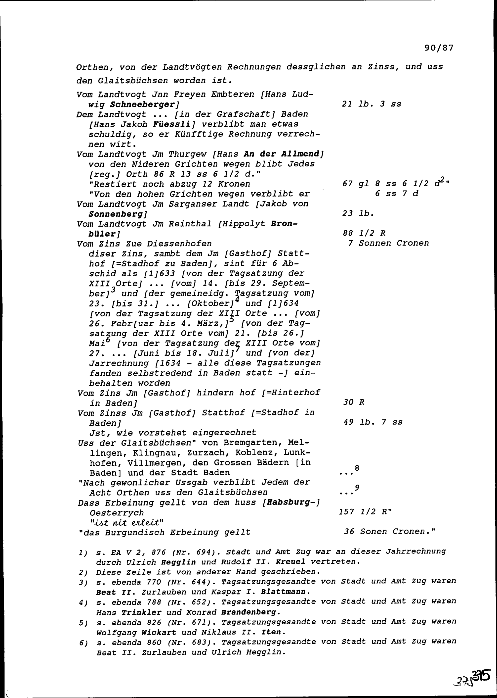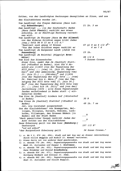 Abrechnung für Stadt und Amt Zug über die an der Jahrrechnung in Baden 1634 erhaltenen...