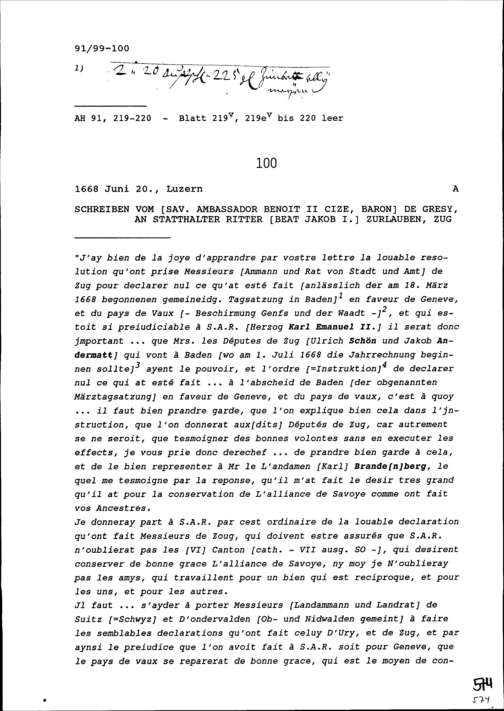 Schreiben von Benoît II. Cize, Baron de Grésy, Ambassador von Frankreich, an Beat Jakob I. Zurlauben, Statthalter, Zug