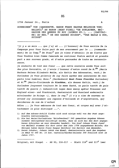 Schreiben von Franz Kaspar Melchior von Hallwil, Gardehauptmann, an Beat Fidel Zurlauben, Brigadier, Zug