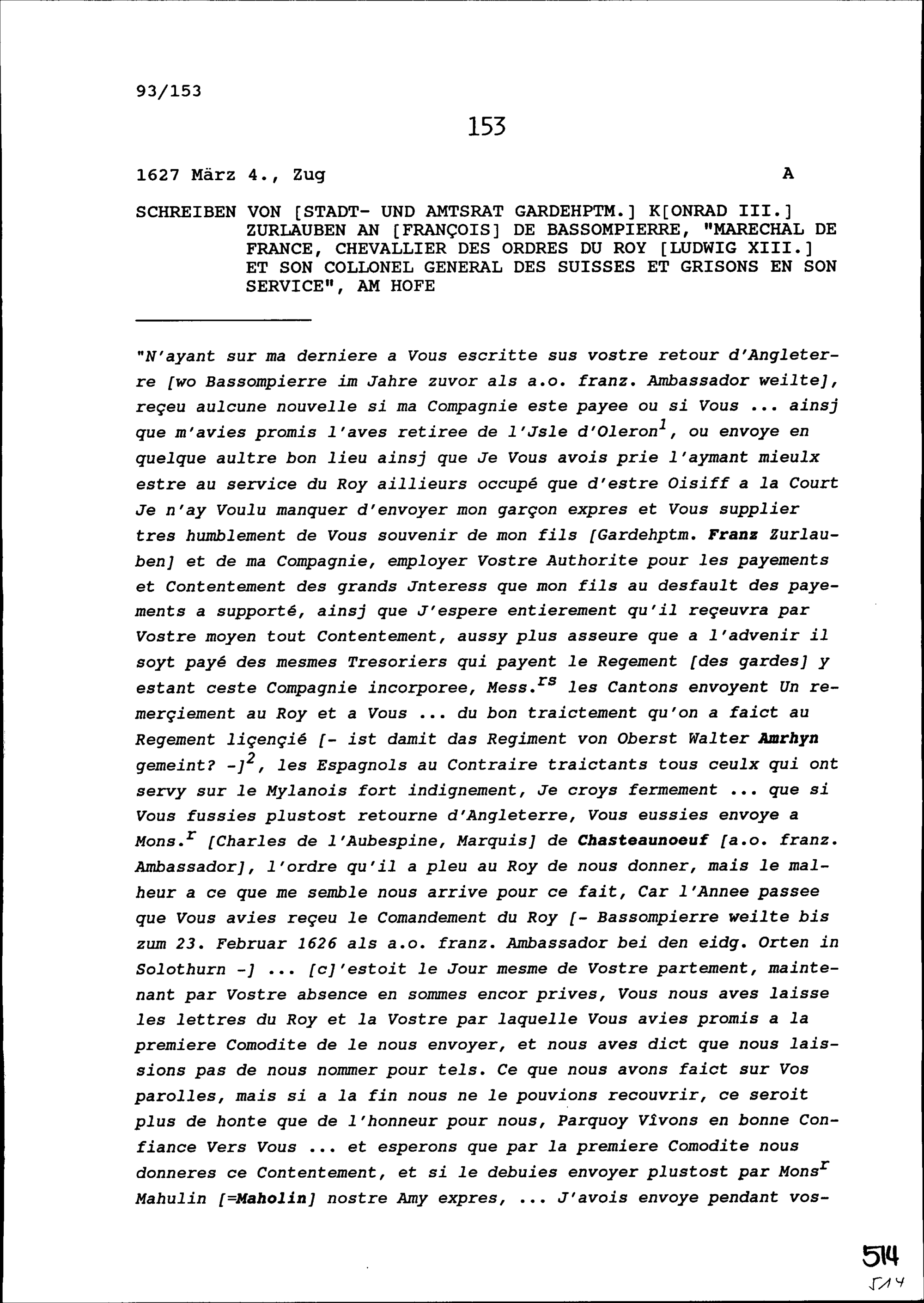 Schreiben von Konrad III. Zurlauben, Stadt- und Amtrat und Gardehauptmann, an François de Bassompierre, Maréchal de France