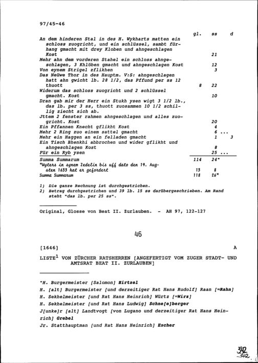 Zürcher Ratsherren, angefertigt von Beat II. Zurlauben, Stadt- und Amtrat Zug