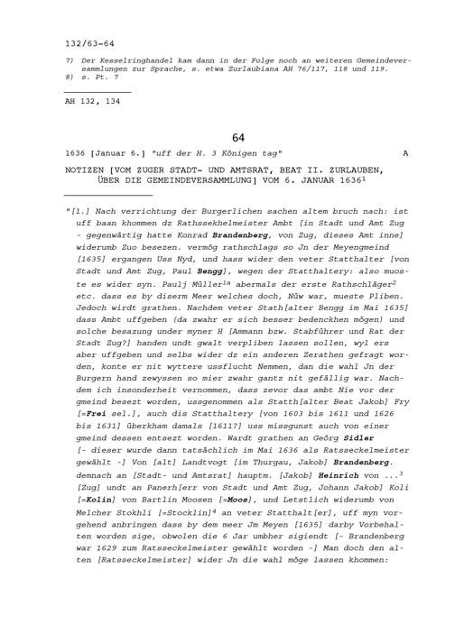 Notiz von Beat II. Zurlauben, Ammann von Stadt und Amt Zug, über die Gemeindeversammlung der Stadt Zug vom 21. Mai 1634