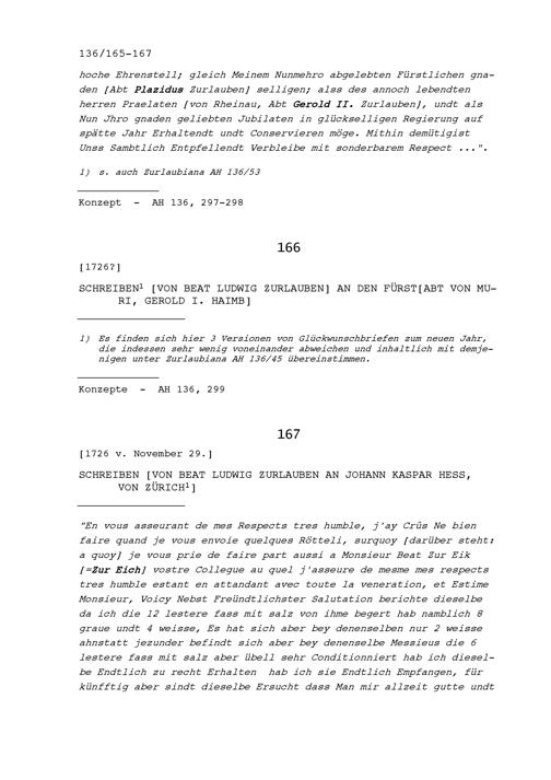 Schreiben von Beat Ludwig Zurlauben an Gerold I. Haimb, Fürstabt von Muri