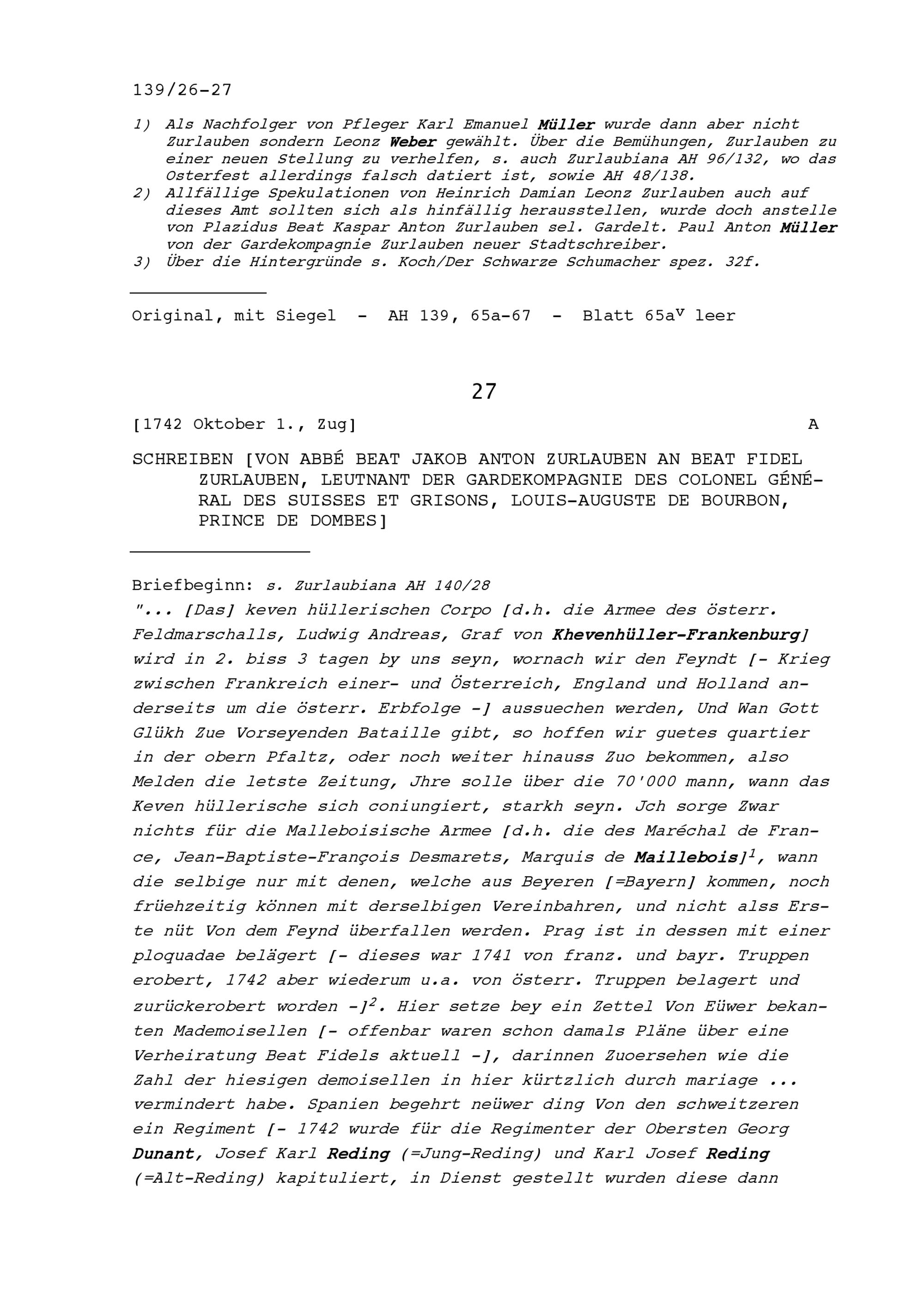Schreiben von Heinrich Damian Leonz Zurlauben, Wallfahrer, an Fidel Zurlauben, Altammann...