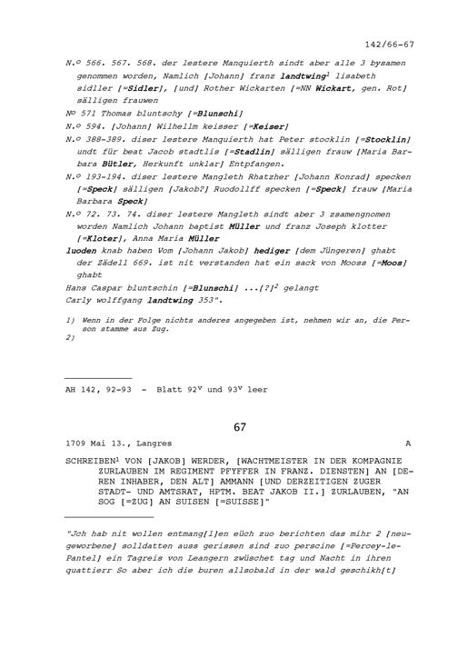 Notiz von Beat Jakob II. Zurlauben, Stabführer der Stadt Zug, in Zusammenhang mit...