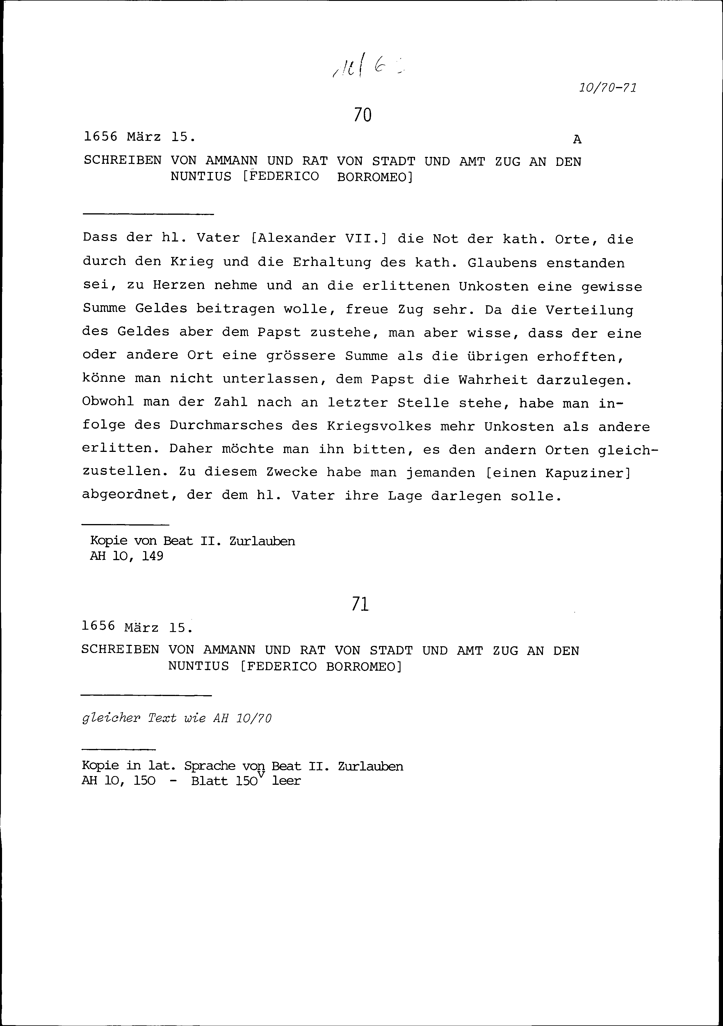 Schreiben des Ammanns und Rats von Stadt und Amt Zug an Federico Borromeo, Nunti...