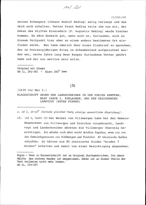 Schreiben von Sebastian Reding an Beat Kaspar Zurlauben, Zug