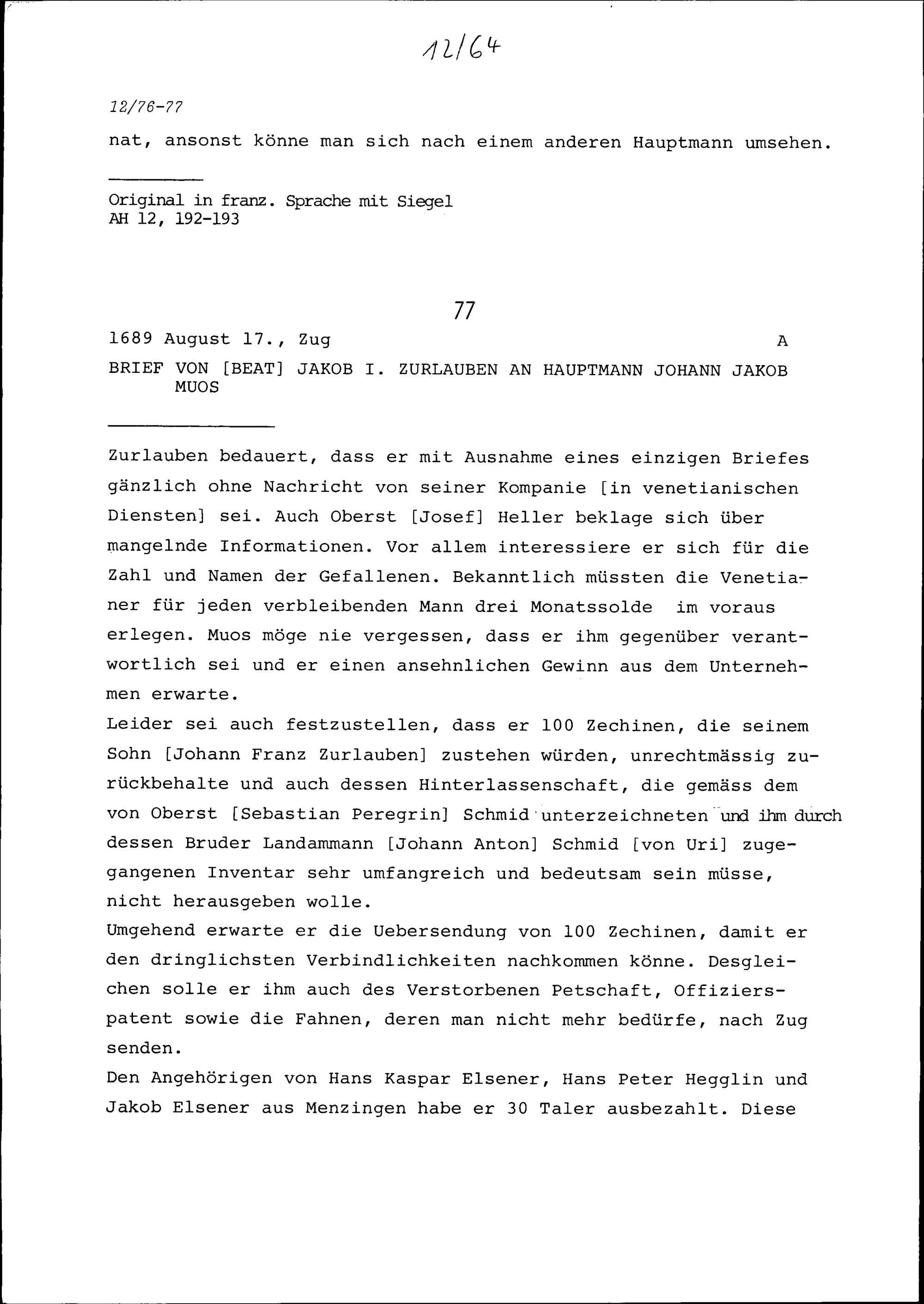 Schreiben von Johann Jakob Muos, Hauptmann, an Beat Jakob I. Zurlauben, Zug