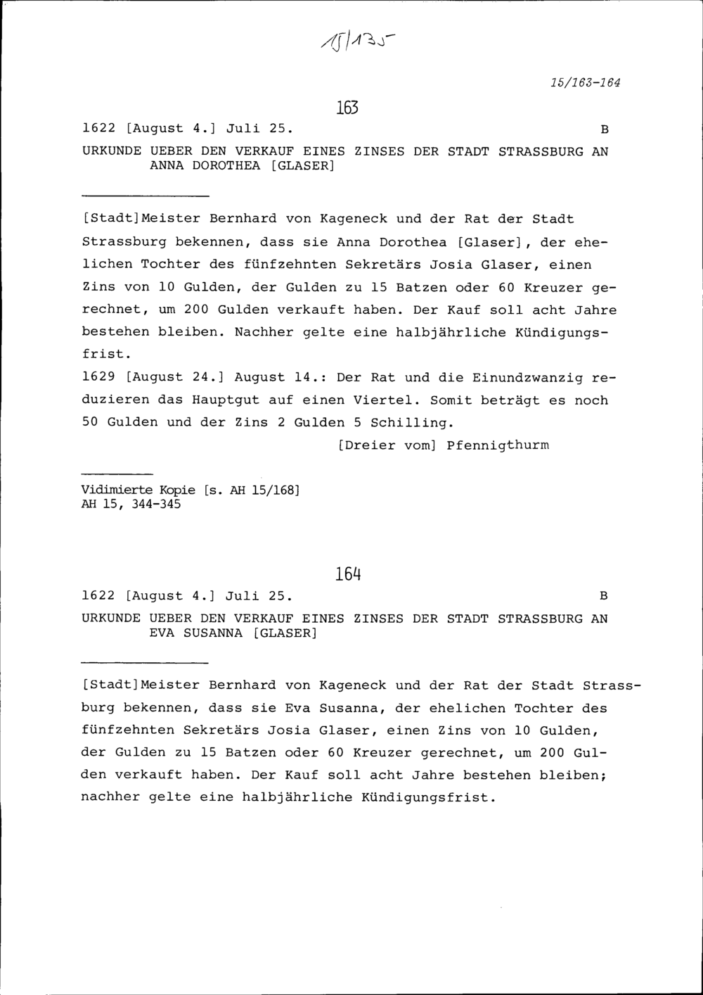 Urkunde über den Verkauf eines Zinses der Stadt Strassburg an Eva Susanna Glaser