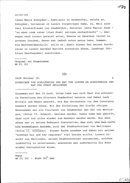 Schreiben von Anton Schnyder, Stadtschreiber von Mellingen, an Beat II. Zurlauben,...