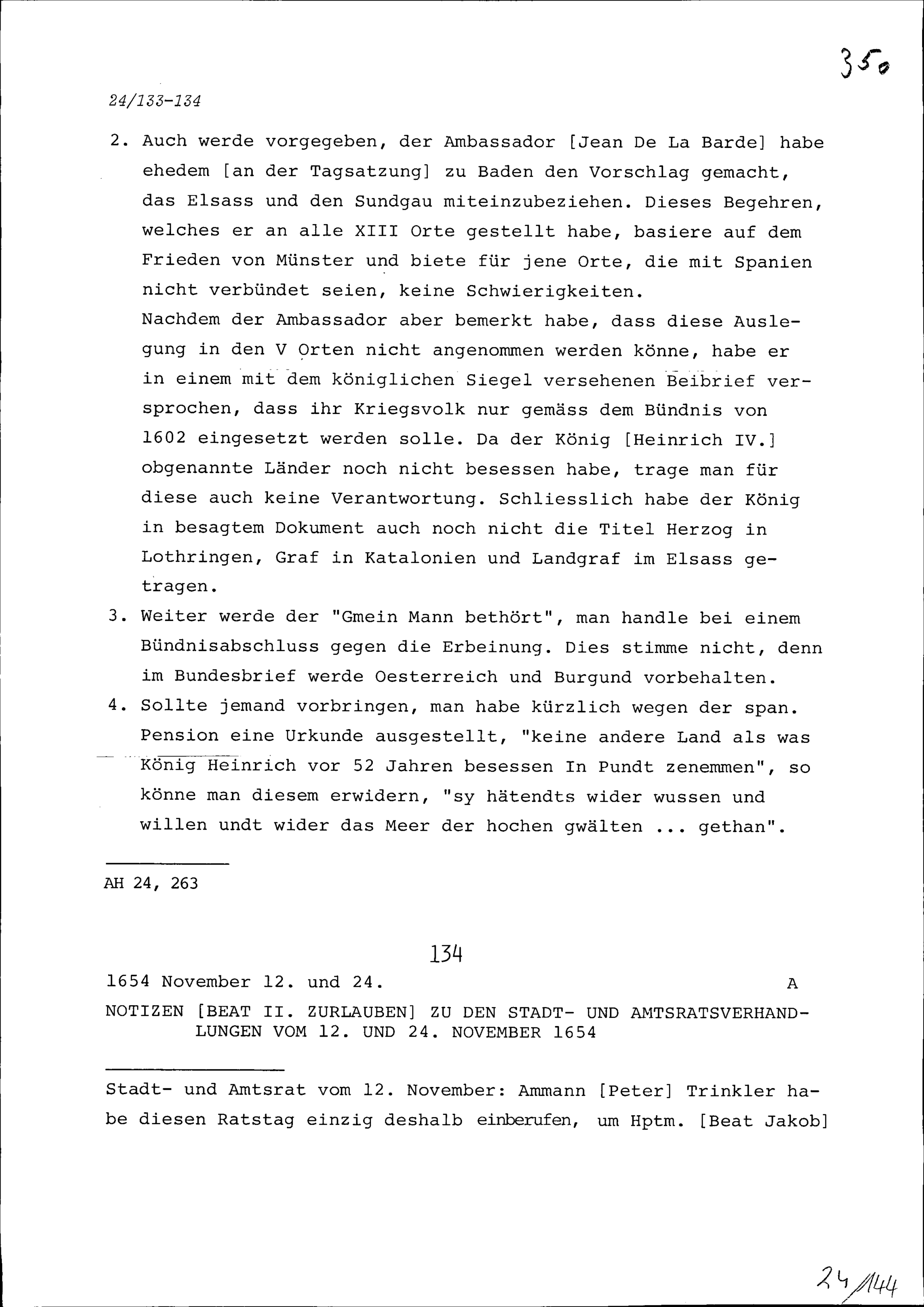 Notiz von Beat II. Zurlauben zur französischen Bündniserneuerung