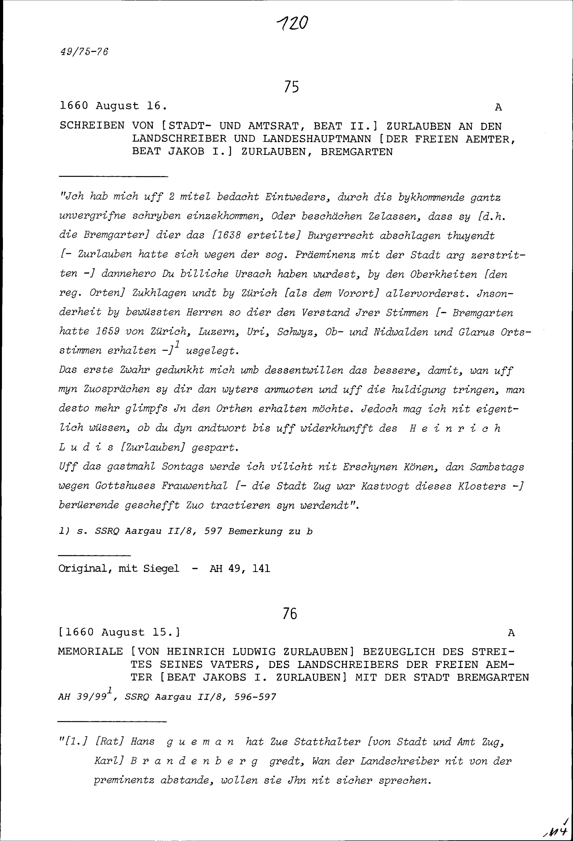 Bericht von Heinrich Ludwig Zurlauben bezüglich des Streits seines Vaters und von Beat Jakob I. Zurlauben, Landschreiber der Freien Ämter, mit der Stadt Bremgarten
