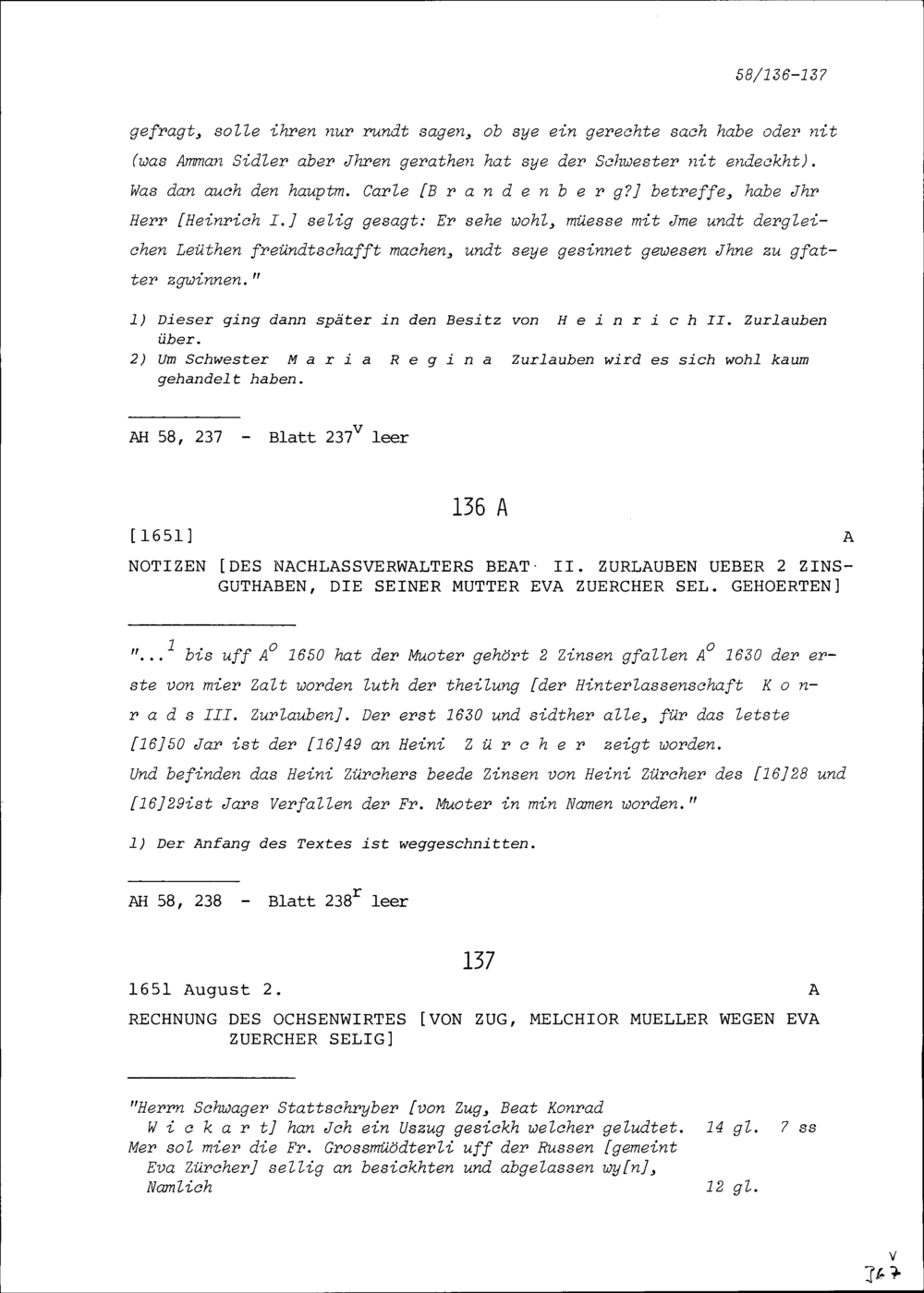 Notiz von Beat II. Zurlauben, Nachlassverwalter, zum Streit mit Anna Elisabeth Wallier...