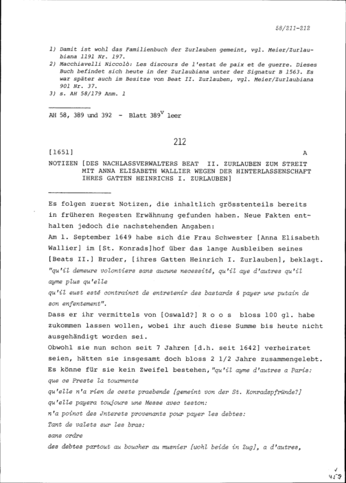 Notiz von Beat II. Zurlauben, Nachlassverwalter, zum Streit mit Anna Elisabeth Wallier wegen der Hinterlassenschaft Heinrich I. Zurlauben