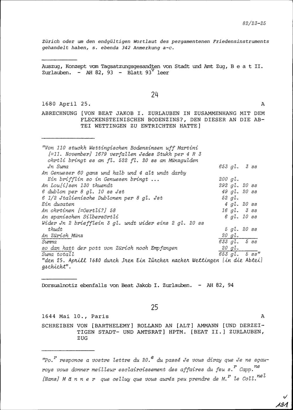 Schreiben von Barthélémy Rolland an Beat II. Zurlauben, Hauptmann und Stadt- und...
