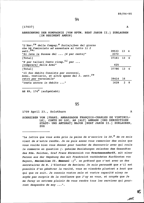 Schreiben von François-Charles de Vintimille, Graf du Luc, Ambassador von Frankreich, an Beat Jakob II. Zurlauben, Altammann, Stadt- und Amtrat und Major, Zug