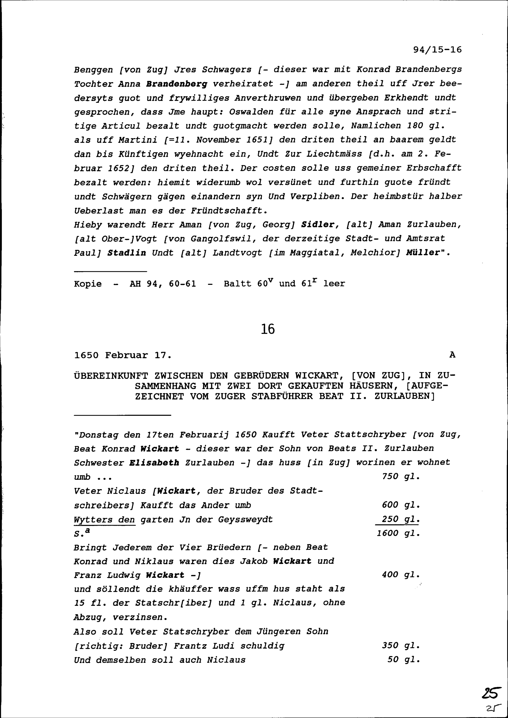 Vergleich zwischen den Erben von Konrad Brandenberg, Statthalter, einerseits und Oswald Bengg anderseits, aufgezeichnet von Beat II. Zurlauben, Zuger Stabführer