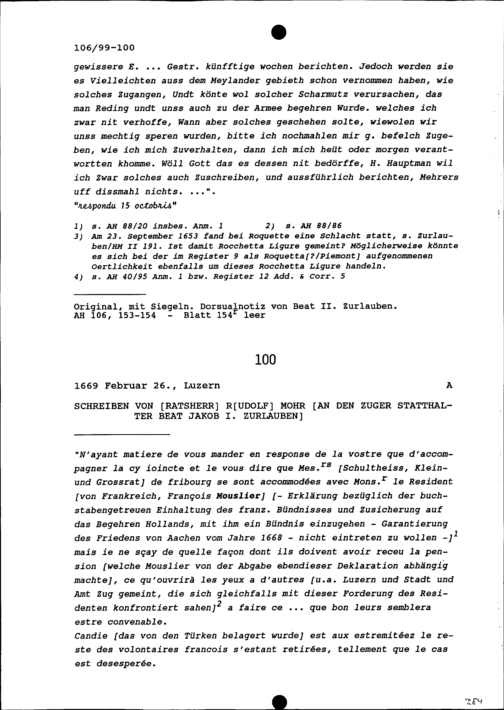 Schreiben von Hans Jakob Hermann, Gardefähnrich in der Kompanie von Heinrich II. Zurlauben, Gardehauptmann, an Beat II. Zurlauben, Altammann und Stadt- und Amtrat, Zug