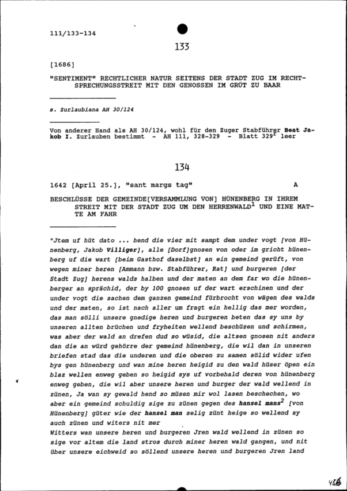 Beschlüsse der Gemeindeversammlung von Hünenberg in ihrem Streit mit der Stadt Zug um den Herrenwald und eine Matte am Fahr