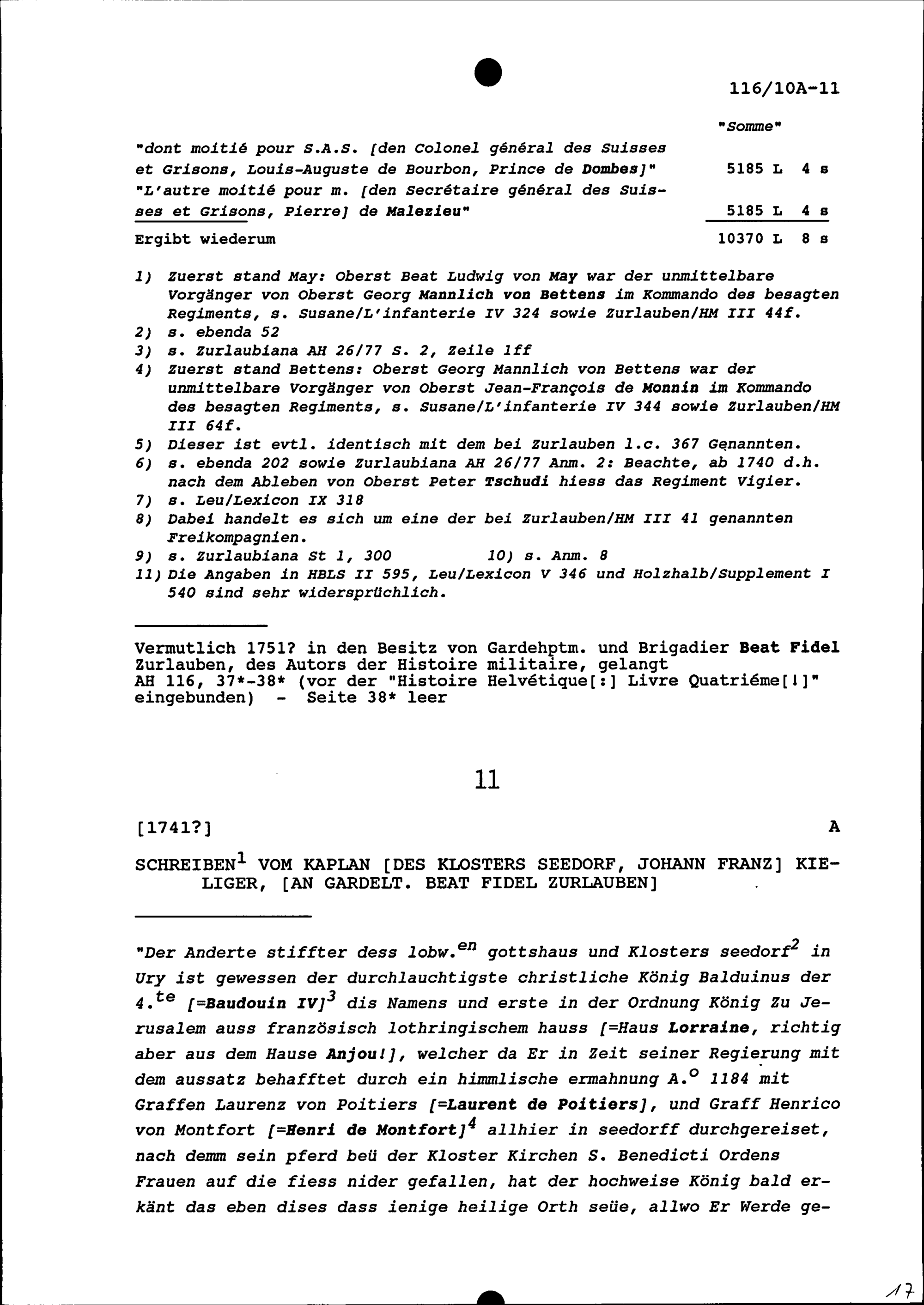 Zahlungen für die ersten sechs Monate 1739 an die Eidgenössischen Regimenter und Freikompanien in französischen Diensten