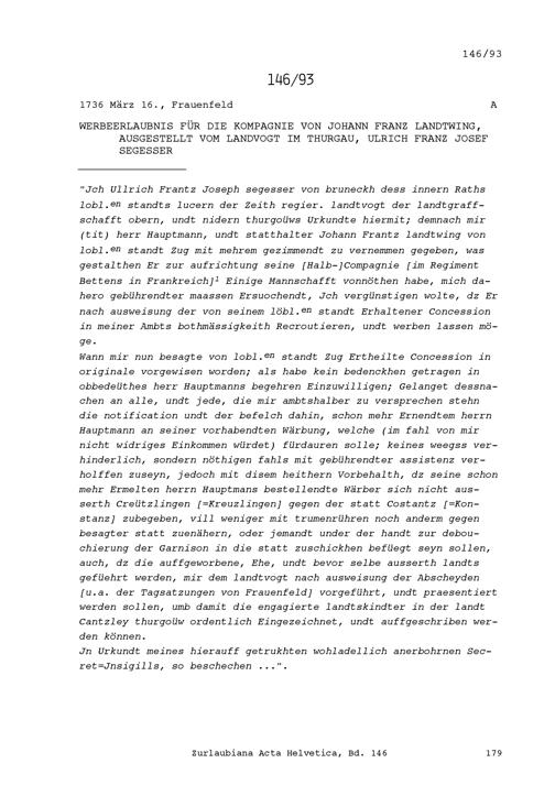 Werbeerlaubnis für die Kompanie von Johann Franz Landtwing, ausgestellt von Ulrich Franz Josef Segesser, Landvogt im Thurgau
