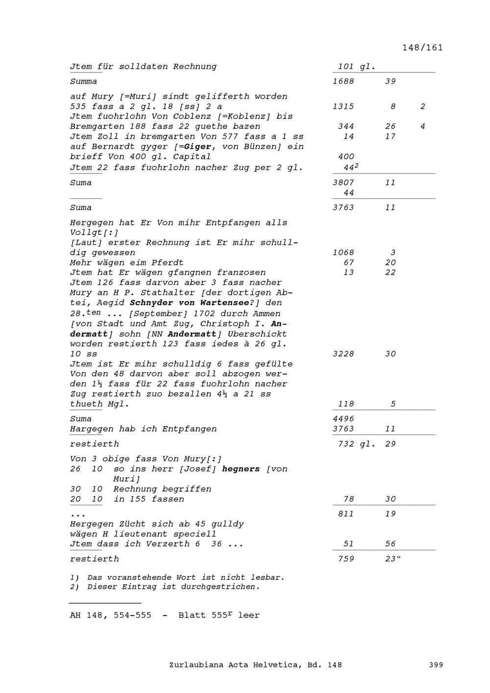 Abrechnung zwischen Beat Jakob II. Zurlauben einerseits und Johann Jakob Hediger, der jüngere, Zuger Salzausmesser, anderseits