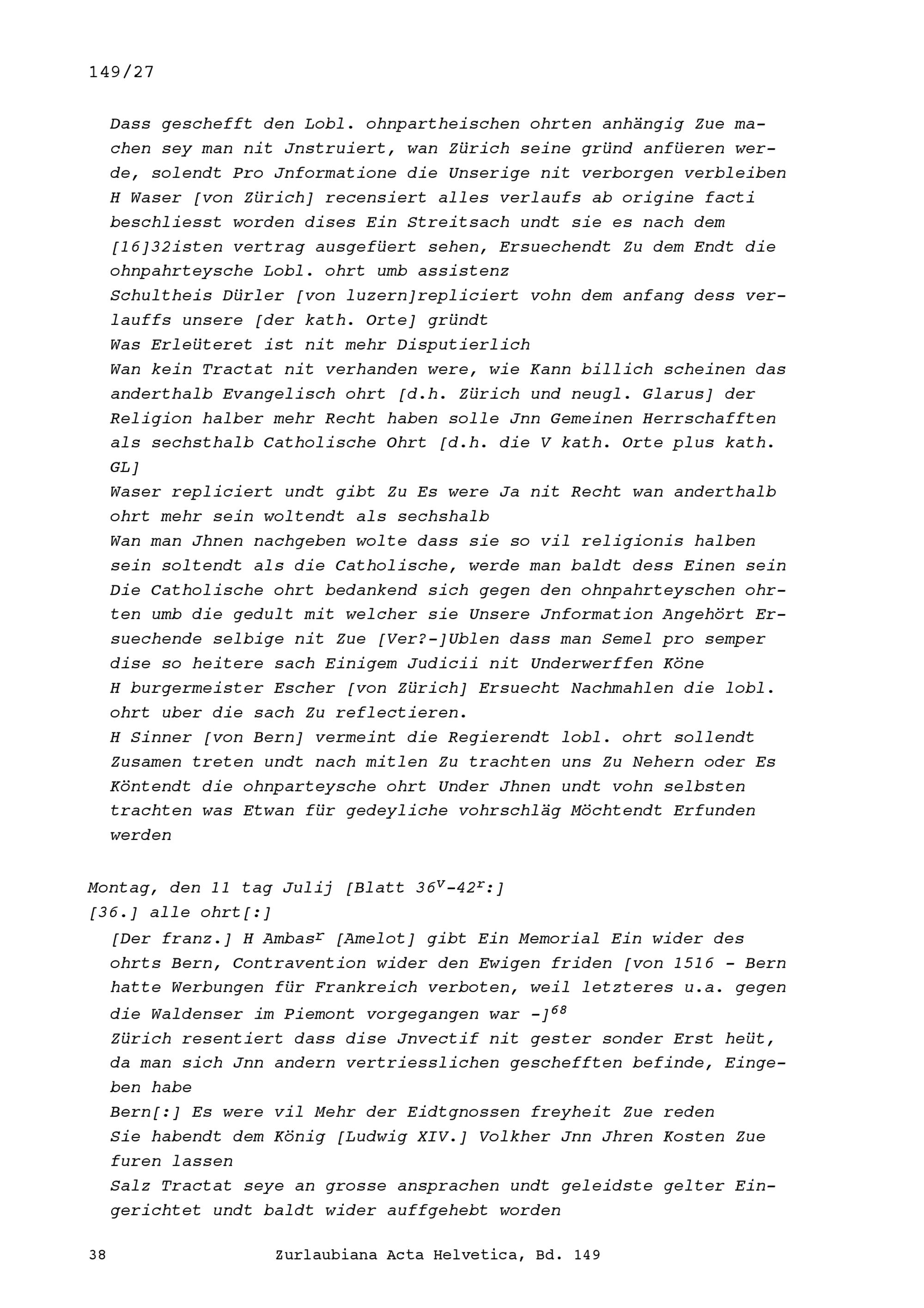 Notiz von Beat Kaspar Zurlauben, Tagsatzungsgesandter von Stadt und Amt Zug, über die am 4. Juli 1695 in Baden begonnene Jahrrechnung