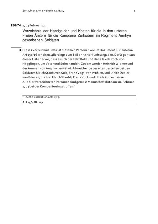 Verzeichnis der Handgelder und Kosten für die in den unteren Freien Ämter für die Kompanie Zurlauben im Regiment Amrhyn geworbenen Soldaten