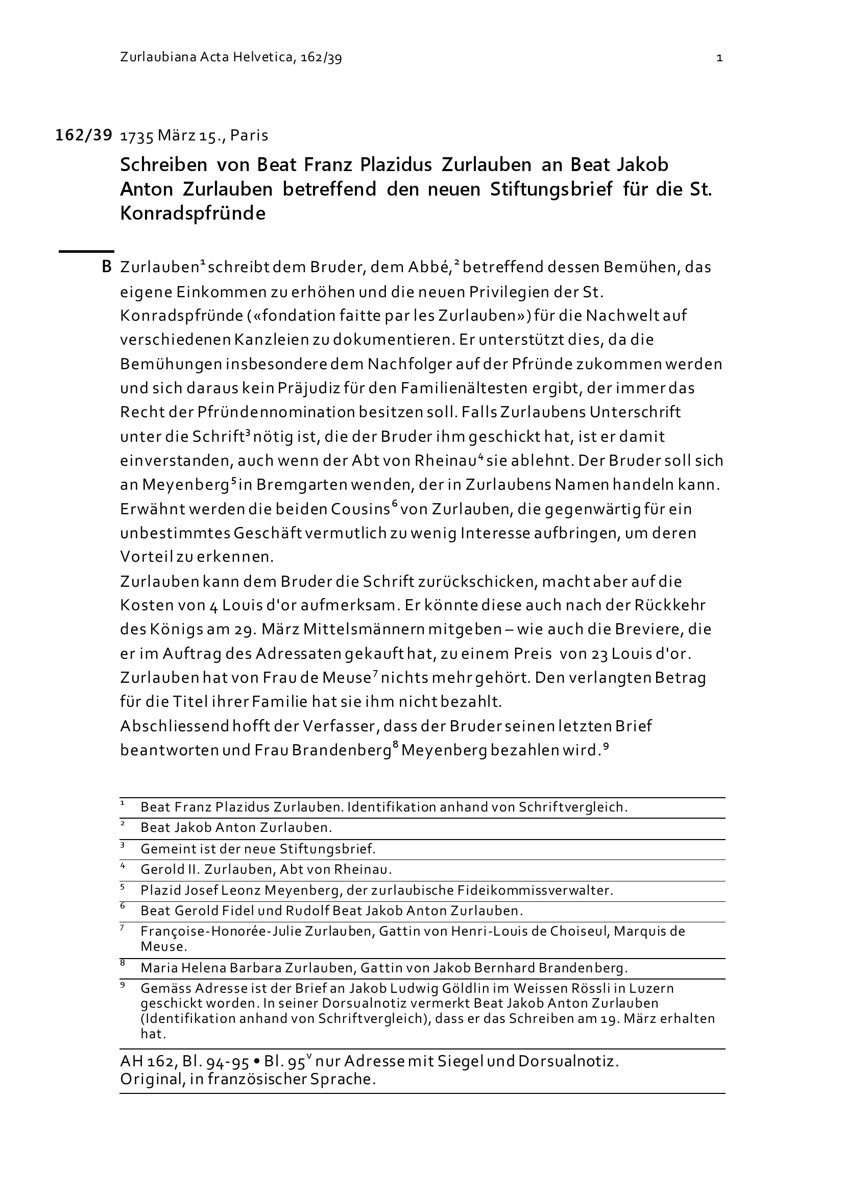 Schreiben von Beat Franz Plazidus Zurlauben an Beat Jakob Anton Zurlauben betreffend den neuen Stiftungsbrief für die Sankt-Konradspfrund