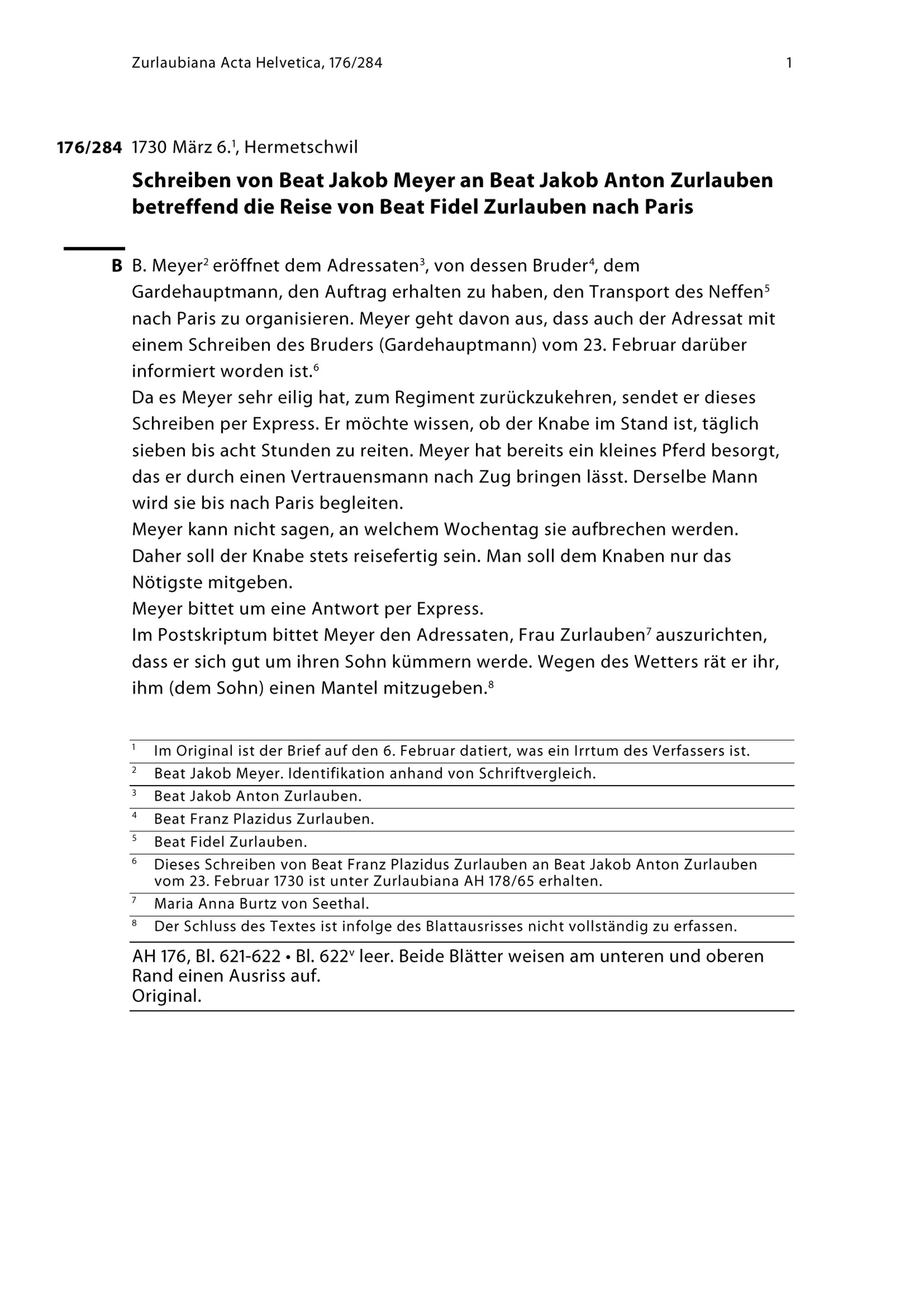 Schreiben von Beat Jakob Meyer an Beat Jakob Anton Zurlauben betreffend die Reise von Beat Fidel Zurlauben nach Paris