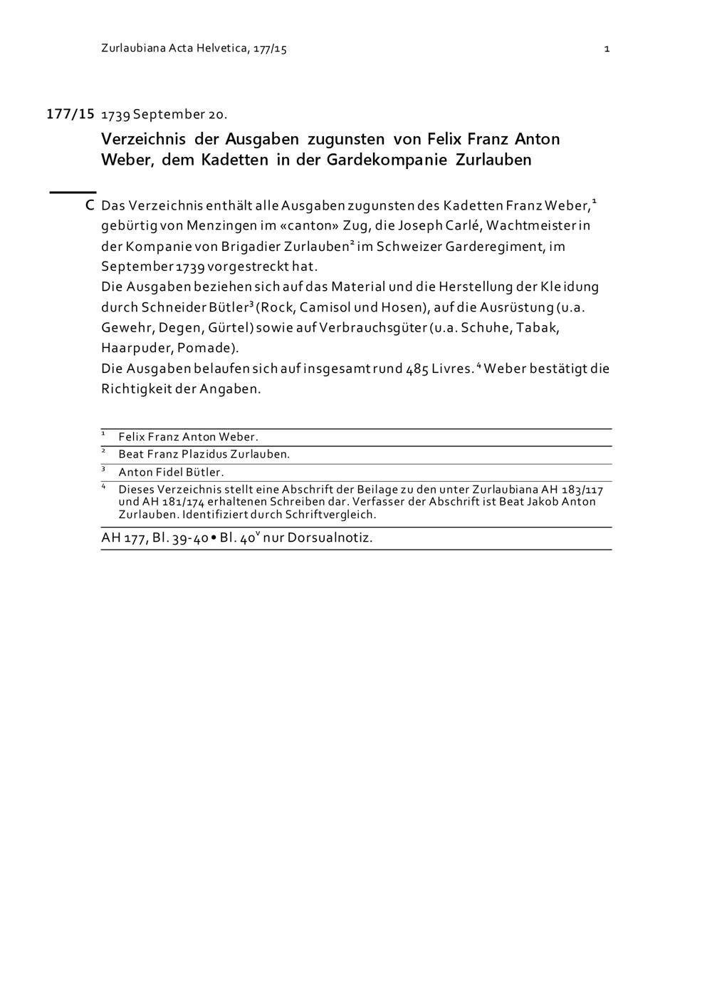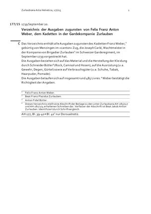 Verzeichnis der Ausgaben zugunsten von Felix Franz Anton Weber, dem Kadetten in der Gardekompanie Zurlauben