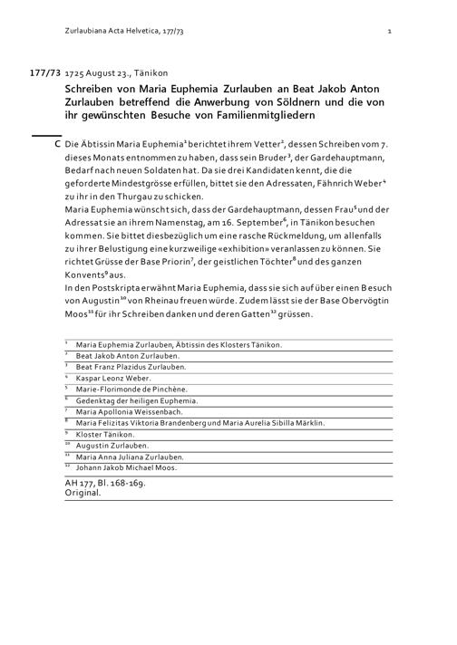 Schreiben von Maria Euphemia Zurlauben an Beat Jakob Anton Zurlauben betreffend die Anwerbung von Söldnern und die von ihr gewünschten Besuche von Familienmitgliedern