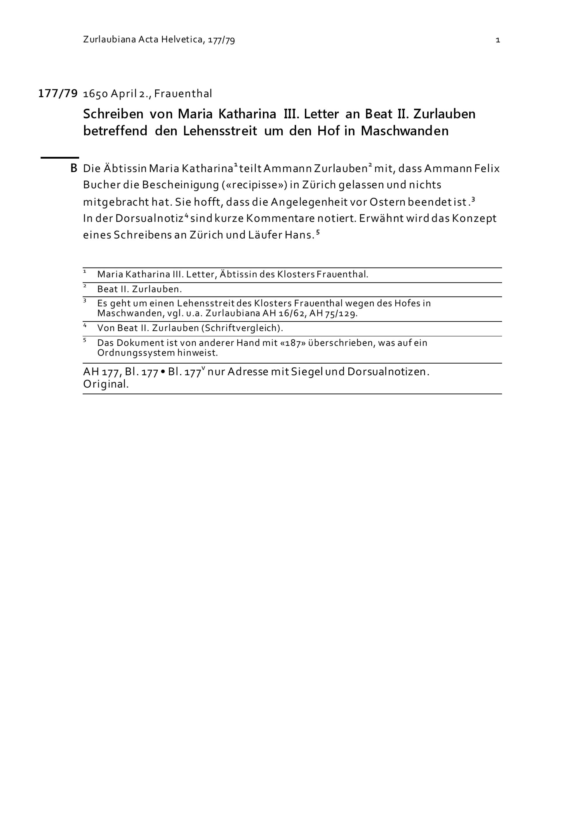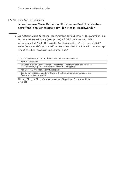 Schreiben von Maria Katharina III. Letter an Beat II. Zurlauben betreffend den Lehensstreit um den Hof in Maschwanden