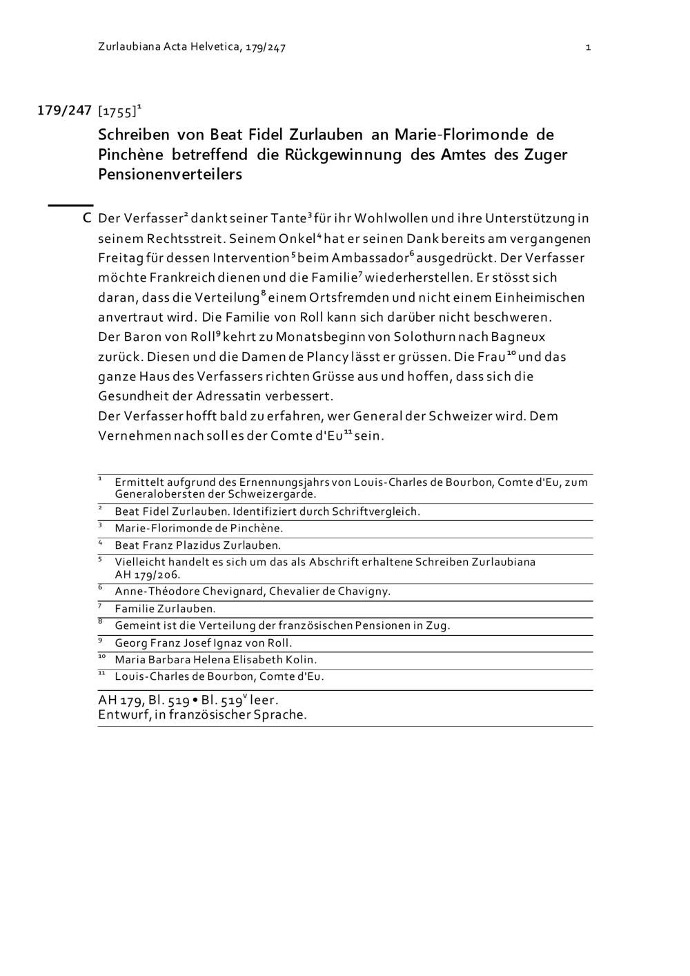 Schreiben von Beat Fidel Zurlauben an Marie-Florimonde de Pinchène betreffend die...
