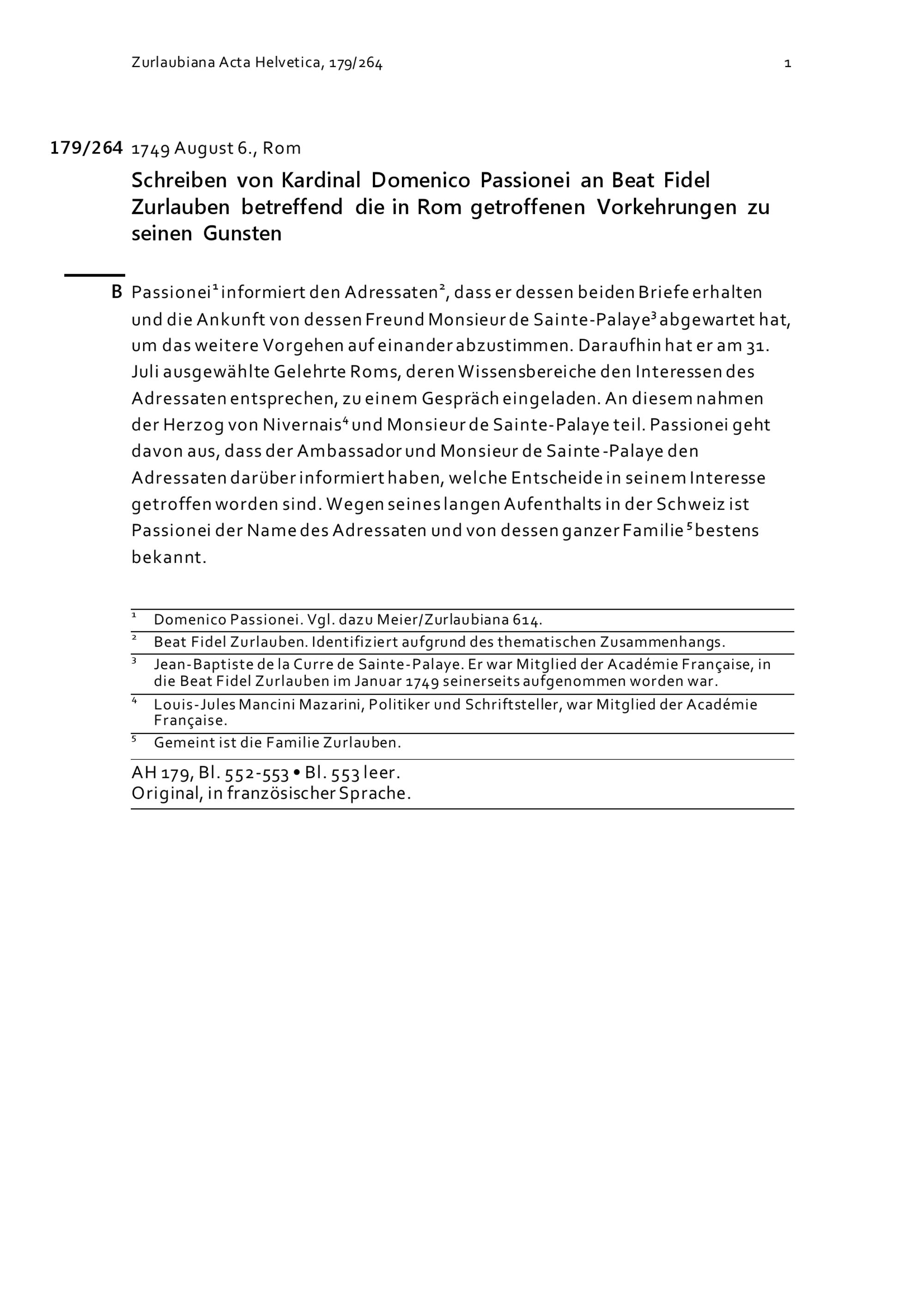 Schreiben von Domenico Passionei, Kardinal, an Beat Fidel Zurlauben betreffend die in Rom getroffenen Vorkehrungen zu seinen Gunsten