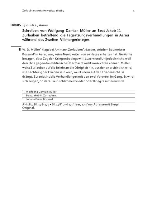 Schreiben von Wolfgang Damian Müller an Beat Jakob II. Zurlauben betreffend die Tagsatzungsverhandlungen in Aarau während des Zweiten Villmergerkriegs