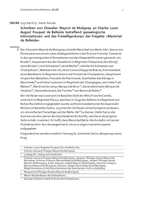 Schreiben von Chevalier Mayrot de Mutigney an Charles Louis August Fouquet de Belle-Isle betreffend genealogische Informationen und das Freiwilligenkorps der Fregatte «Maréchal de Belle-Isle»