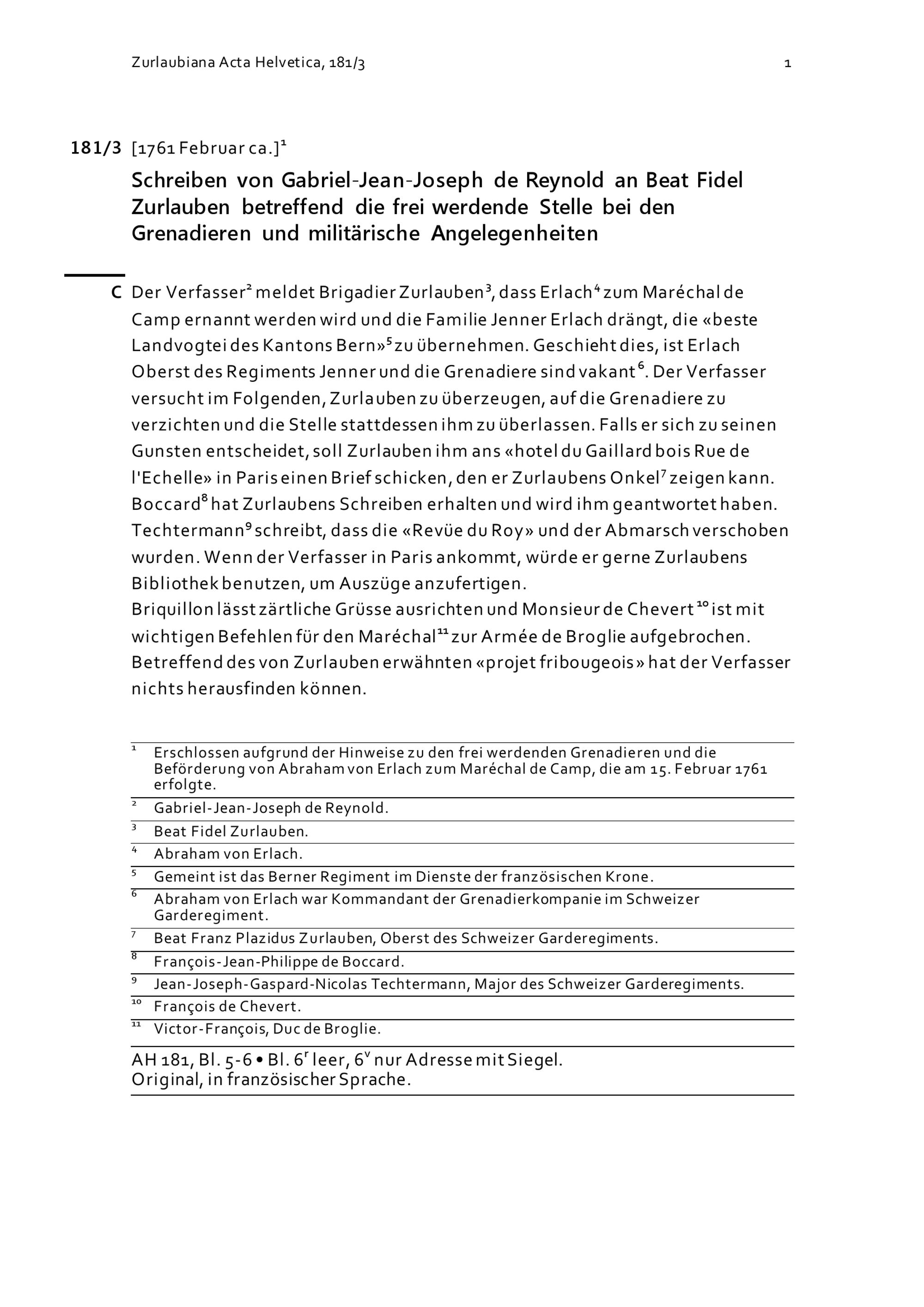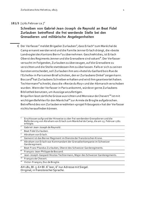 Schreiben von Gabriel-Jean-Joseph de Reynold an Beat Fidel Zurlauben betreffend die...