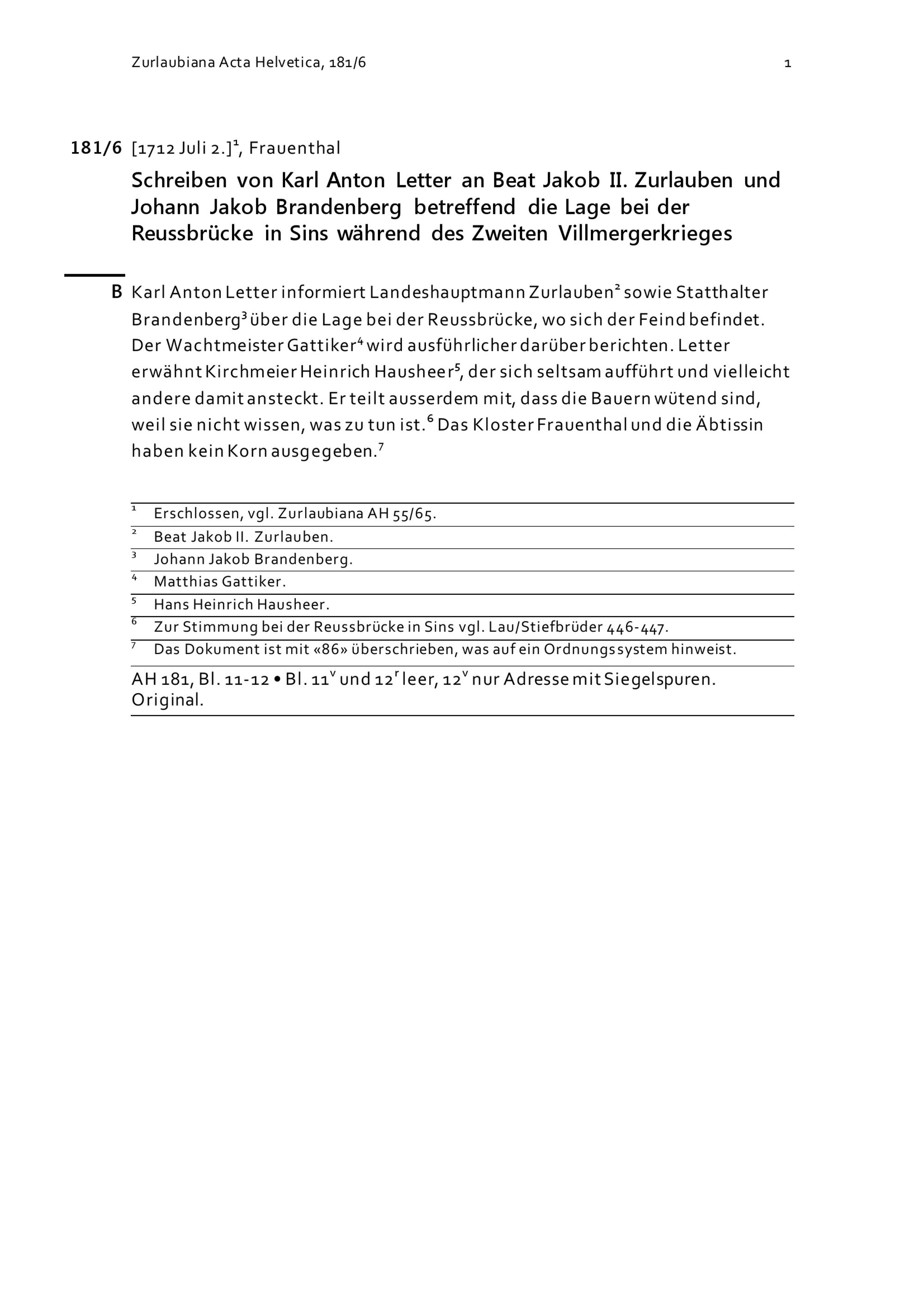 Schreiben von Karl Anton Letter an Beat Jakob II. Zurlauben und Johann Jakob Brandenberg betreffend die Lage bei der Reussbrücke in Sins während des Zweiten Villmergerkriegs