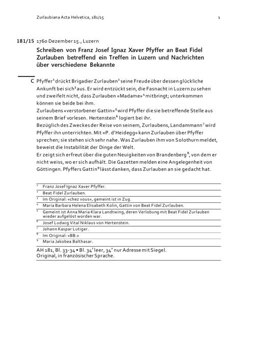 Schreiben von Franz Josef Ignaz Xaver Pfyffer an Beat Fidel Zurlauben betreffend...