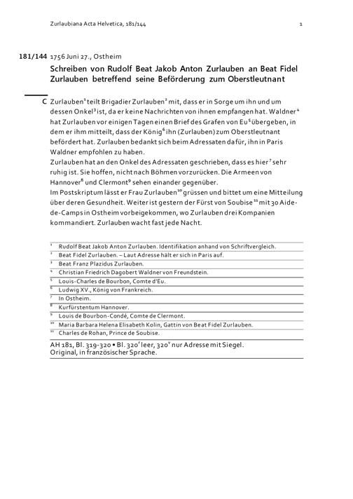 Schreiben von Rudolf Beat Jakob Anton Zurlauben an Beat Fidel Zurlauben betreffend seine Beförderung zum Oberstleutnant